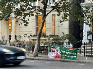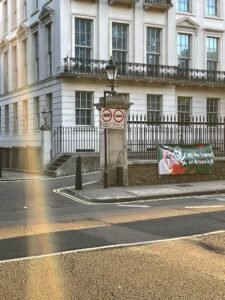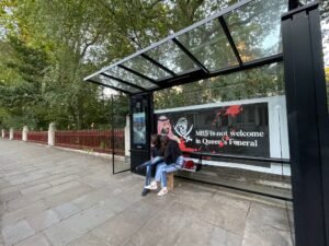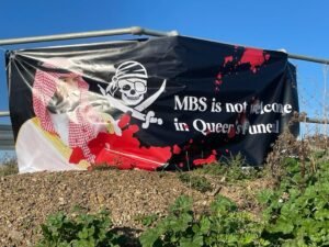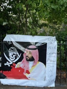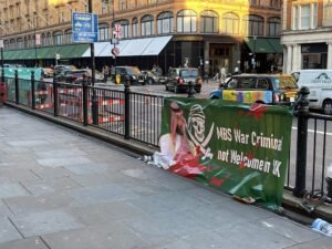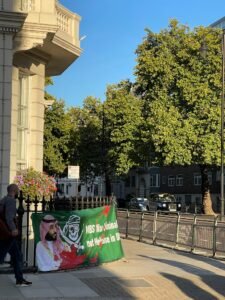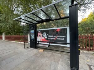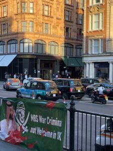 بينما تضج لندن بجنازة الملكة اليزابيث الثانية ووصول خبر حضور محمد بن سلمان ولي عهد السعودية للجنازة حيث أنه شخص غير مرغوب فيه , واحتجاجا على ذلك قام اهالي لندن بمظاهرات واحتجاجات في مختلف المناطق بداية من مطار هيثرو حيث علقو صور ضخم مع صور بن سلمان تقول انه شخص غير مرحب فيه.